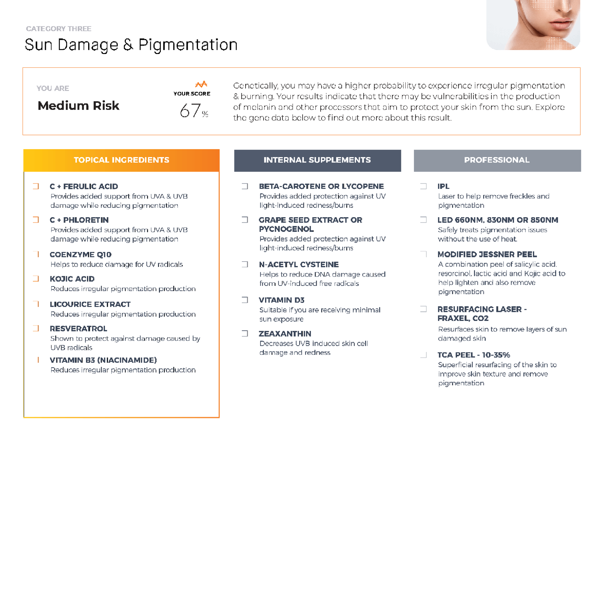Sun Damage & Pigmentation: MySkinDNA test identifies genetic predispositions that play an important role in determining how well your skin can naturally cope under the strains of the sun.