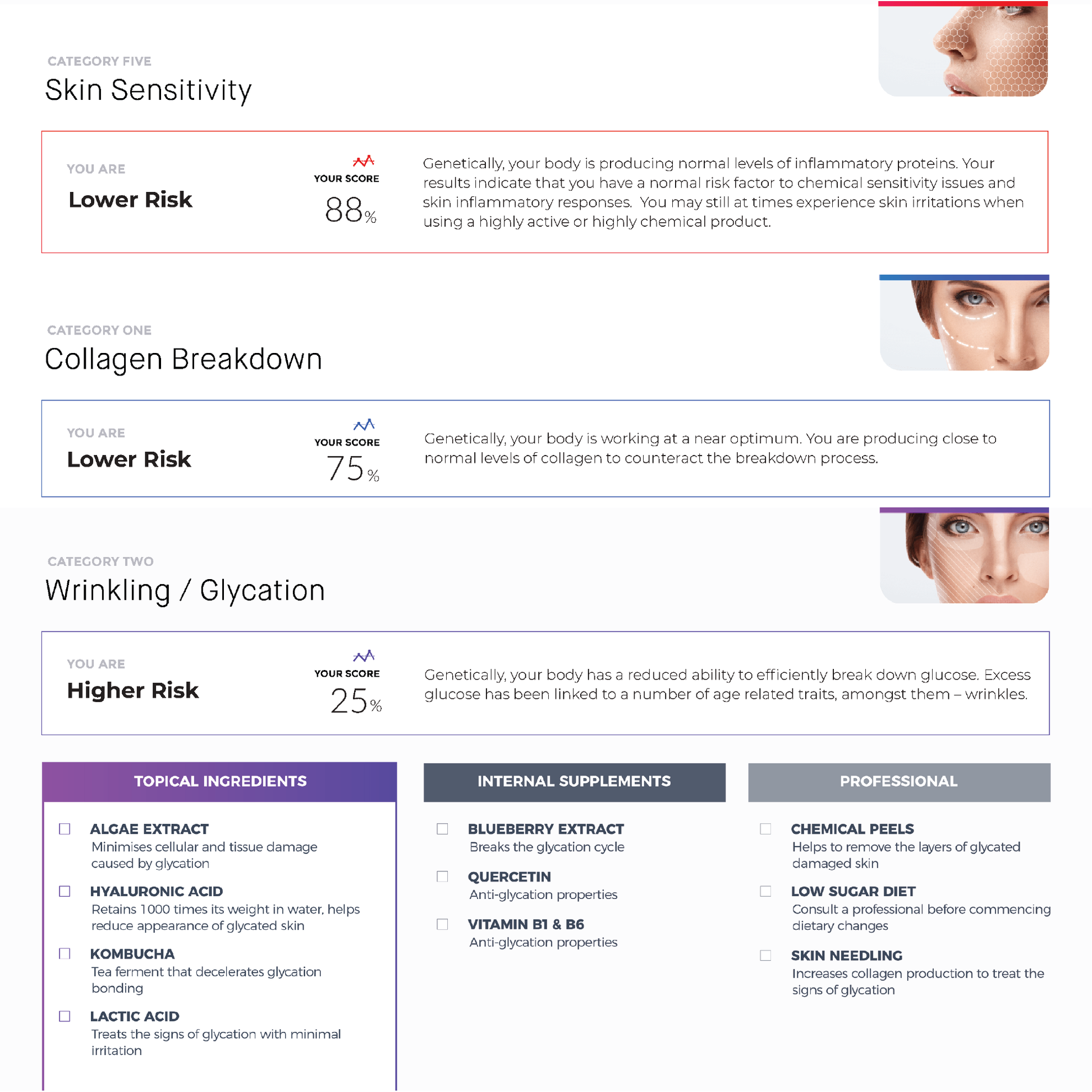 In addition to providing insights into your genetic makeup, MySkinDNA report reveals the most suitable categories of topical and professional treatments, as well as internal supplements. This comprehensive approach enables you to customize your skincare regimen in alignment with your unique genetic profile.