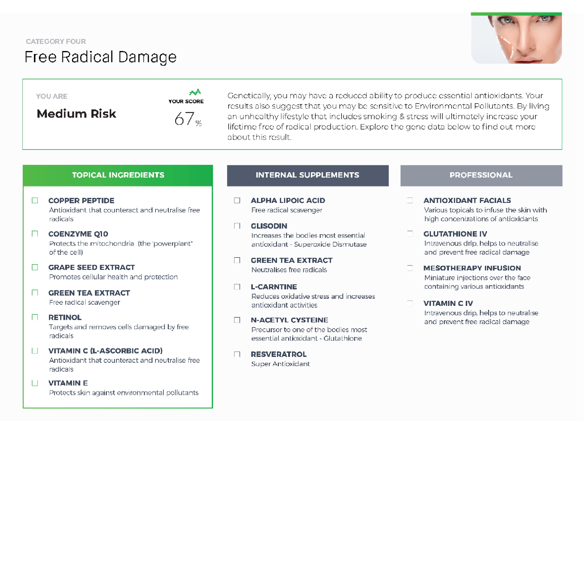 Free Radical Damage: There are 2 main types of antioxidants produced by your body which stop the damage of free radicals. MySkinDNA tests the two main types of antioxidants produced by the body as well as other genetic markers responsible for protecting skin against free radicals.